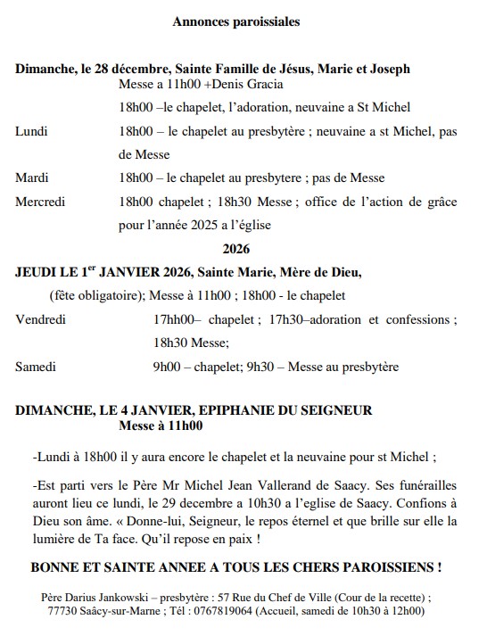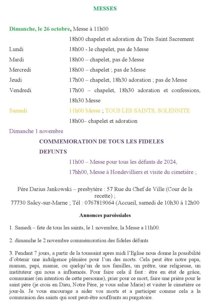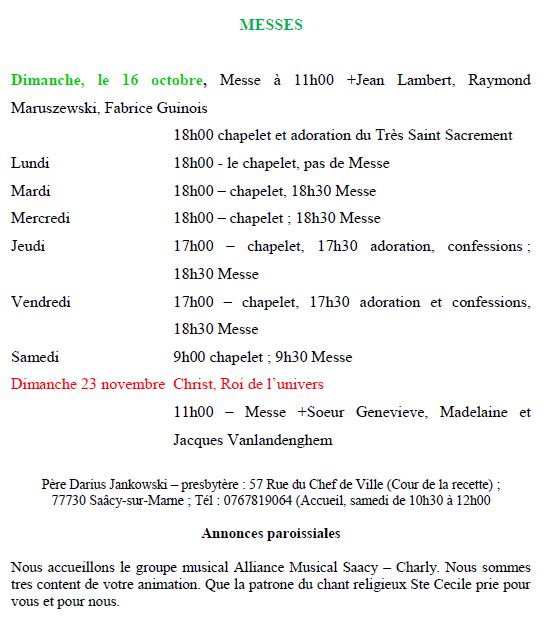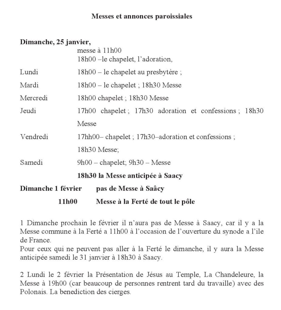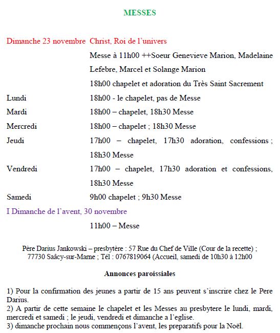 • Retraite prêchée par le P. François Garreau (pour réfléchir à la place que prend la Messe dans sa vie, est-ce une simple formalité pour moi, une habitude sociale ou alors besoin vital ? quel est le sens de la Messe…)