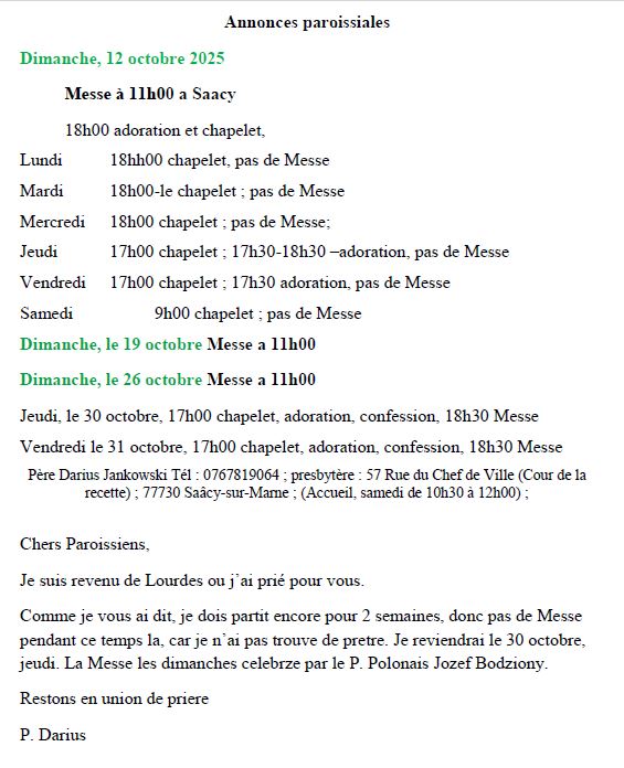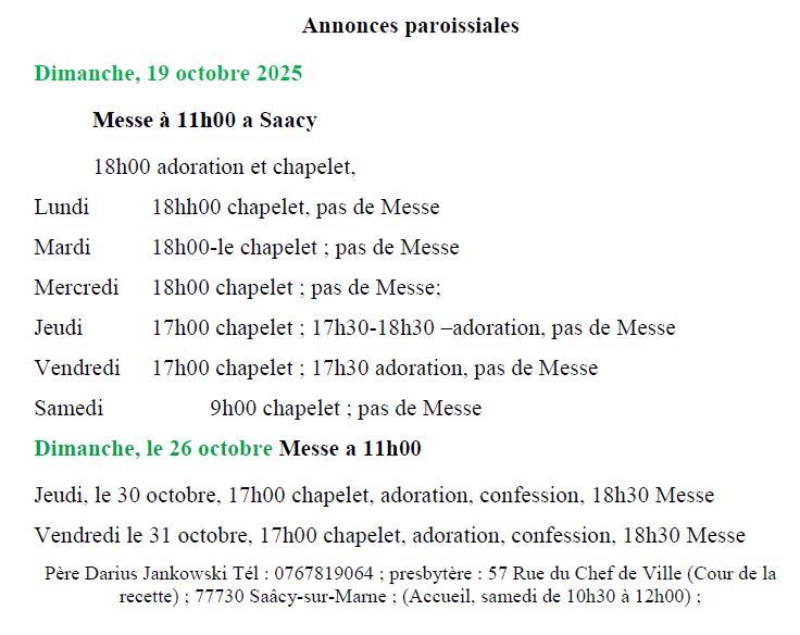 Retrouvons-nous donc nombreux à l'Église de La Ferté-sous-Jouarre (exceptionnellement cette année) à 18h30 pour confier au Seigneur, cette année pastorale.